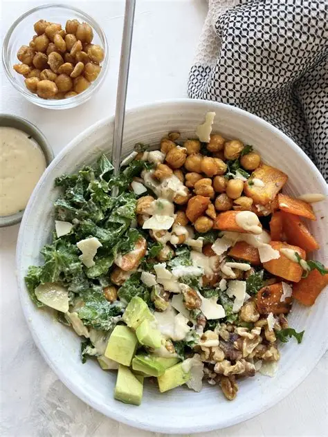 Irresistible Kale Caesar Salad with Sweet Potatoes & Crispy Chickpeas